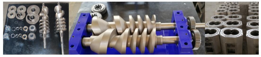 螺桿真空泵屬于非接觸型干式泵,主要部件是一對旋向中目反的螺桿, 與泵體組成封閉的腔體, 兩個螺旋轉(zhuǎn)子作同步反向的高速旋轉(zhuǎn), 電機的傳動軸連接主動轉(zhuǎn)子, 通過一對高精度的同步齒輪帶動從動螺桿, 通過兩轉(zhuǎn)子的日齒合達(dá)到抽氣的目 的。 螺桿與泵體之間, 兩螺桿之間留有間隙, 相互間無摩擦, 具有抽速范圍寬、 結(jié)構(gòu)簡單緊湊、抽氣腔元件無摩擦、 壽命長、 能耗低、 無油污染等優(yōu)點。 能抽除含有大量蒸汽和少量粉塵的氣體, 不易堵塞, 清洗方便。
