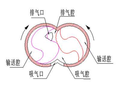 對稱爪型單級干式真空泵是一種旋轉式容積真空泵,在泵腔中有兩個對稱的共軛嚙合的爪型轉子,兩爪之間,爪與殼體之間留有間隙,互不接觸。電機的傳動軸連接主動轉子,通過一對高精度的同步齒輪帶動從動轉子,在泵腔中作同步反向的高速旋轉。兩爪子的嚙合將腔體分成吸氣腔,排氣腔和輸送腔,隨著爪子的轉動,吸氣腔體積逐漸變大,轉到排氣側,體積變小,將氣體壓縮,并從排氣口排出。隨著爪子的連續(xù)轉動,吸氣和排氣的過程周而復始的進行,每轉一周,吸氣和排氣各二次。